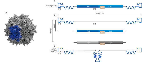 •  Adeno-associated virus (AAV) is a member of the parvoviridae family. It is a type of non-replicating, non-enveloped, icosahedral microvirus with a diameter of approximately 20-26 nm, containing about 4.7 kb of linear single-stranded DNA as its genome. The recombinant adeno-associated virus (rAAV)vectoris a gene vector modified from non-pathogenic wild-typeAAV. Due to its diversity, extremely low immunogenicity, high safety, broad host cell range (infecting both dividing and non-dividing cells), strong dispersibility, and long in vivo gene expression time, rAAVisconsidered one of the most promising vectors for gene research and gene therapy.