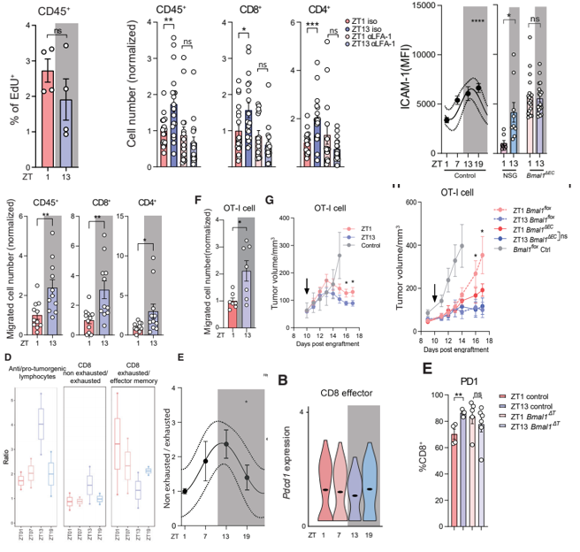 随后,作者顺利获得注射免疫细胞至处于不同时间节律的荷瘤小鼠模型,进一步确认其浸润是受到时间节律的影响。作者分别给处于ZT1和ZT13的荷瘤小鼠注射了OVA-specific CD8+T细胞(OT-l cell),2小时后观察发现ZT13注射的小鼠肿瘤内CD8+T细胞数量更多,且后续数日的肿瘤控制效果更佳。鉴于LFA-1是一种整合素抗体,作者还在不同时间段观察了LFA-1的抗原在肿瘤血管内皮细胞上的表达量。结果表明,细胞间粘附因子1(ICAM-1)是其中唯一表现出昼夜节律的分子。此后,作者在“时间节律基因”敲除小鼠(Cdh5creERT2:Bmal1flox, Bmal1DEC)体内观察到ICAM-1不再随时间变化而变化,并且淋巴细胞浸润也不再出现时间节律。