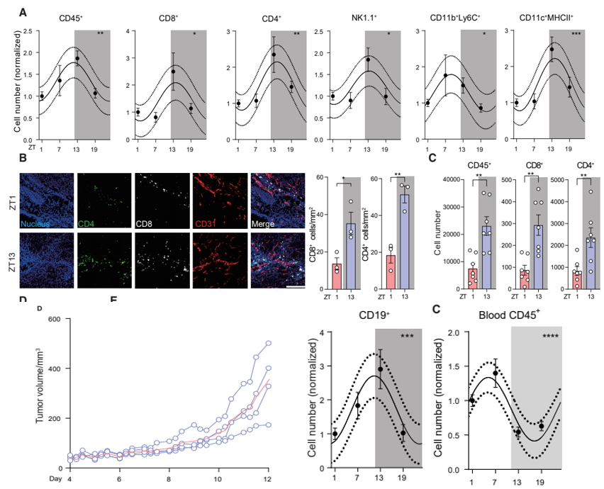 作者第一时间设计了一套标准化的昼夜节律:使用灯光控制节律,一天中12个小时亮灯视为白天,12个小时熄灯视为黑夜。作者顺利获得给C57BL/6小鼠注射表达卵清白蛋白的黑色素瘤细胞(B16-F10-OVA)建立了荷瘤模型。饲养模型小鼠12天后,分别在当天的ZT1(亮灯后1小时),ZT7(亮灯后7小时),ZT13(熄灯后1小时),ZT19(熄灯后7小时)从小鼠身上收集肿瘤,并使用免疫荧光观察肿瘤内不同免疫细胞的数量。作者发现,肿瘤内免疫细胞的数量呈时间节律,且在ZT13时达到峰值。此外,CD8+T细胞,CD4+T细胞,NK1.1+NK细胞,CD11b+ Ly6C+单核细胞,CD11c+ MHCII+树突状细胞等免疫细胞亚群的数量也同样展现出时间节律,但不同时间节点的肿瘤大小和血管密度没有显著差异。